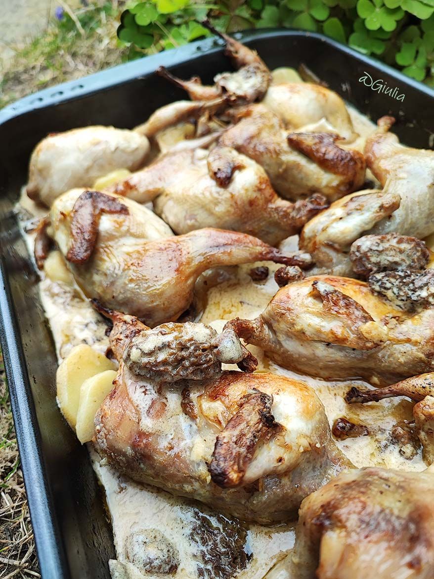 5/ Mélanger les morilles à la crème avec les cailles grillées et terminer la cuisson à feu doux.